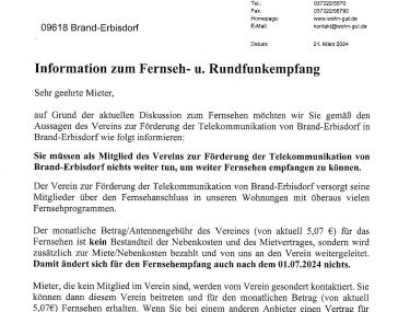Informationsschreiben zum Fernseh- und Rundfunkempfang ab dem 01.07.2024, für Mitglieder des Verein`s zur Förderung der Telekommunikation von Brand-Erbisdorf ändert sich auch im Juli 2024 nichts, der Empfang des Fernsehprogrammes steht unverändert zur Verfügung.