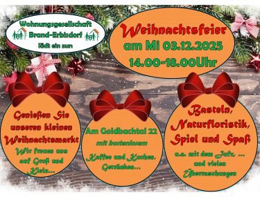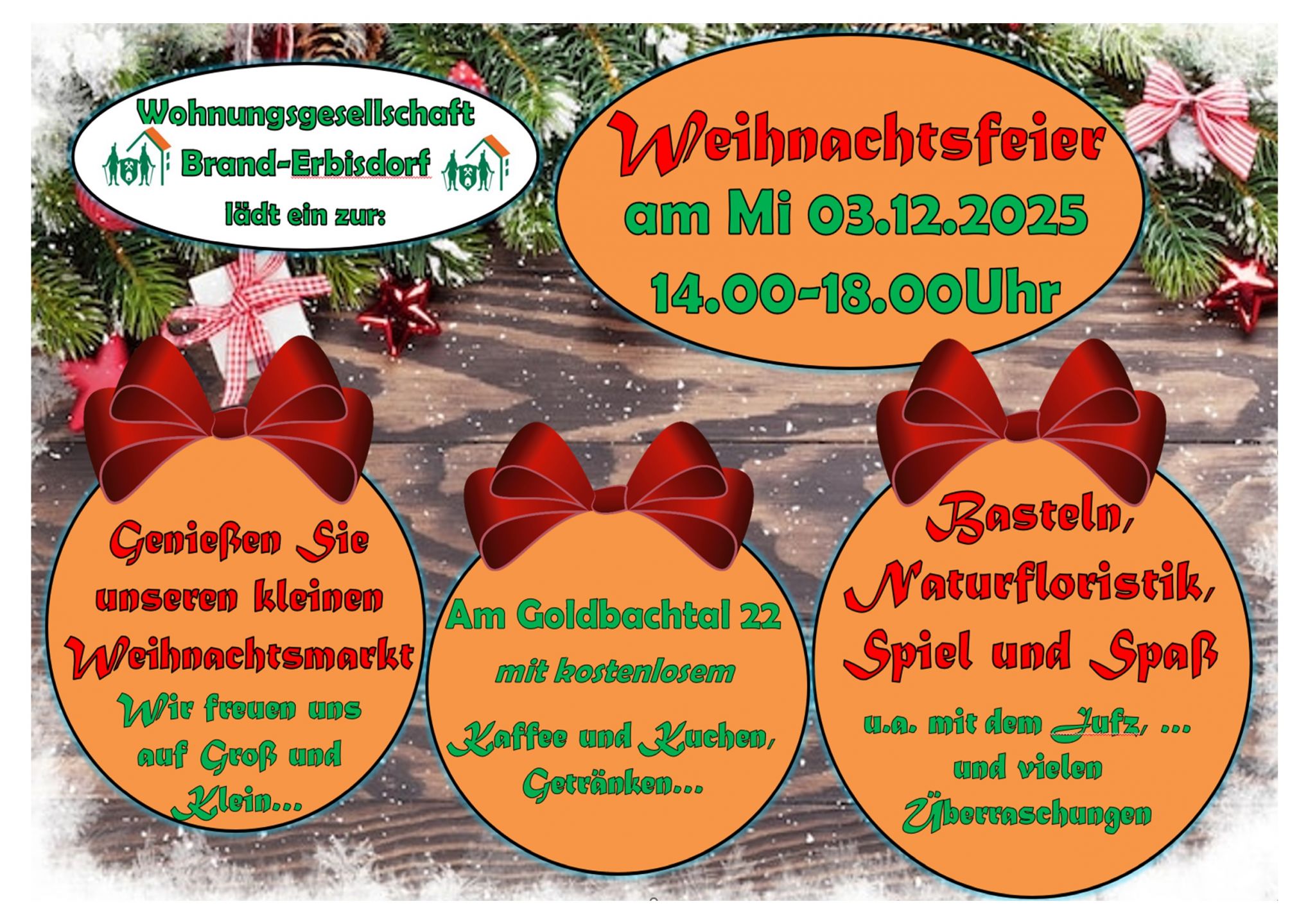 Wir laden ein zur Weihnachtsfeier mit kleinem Weihnachtsmarkt für Groß und Klein mit vielen Überraschungen.
