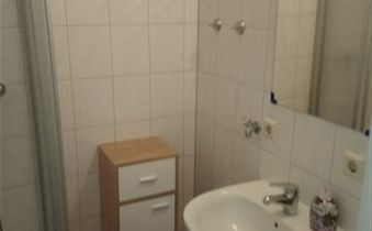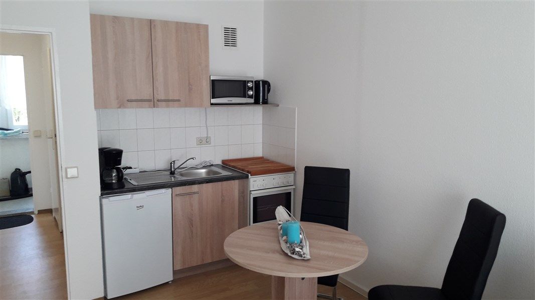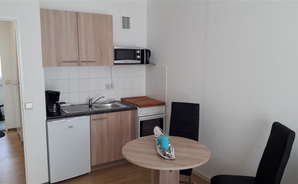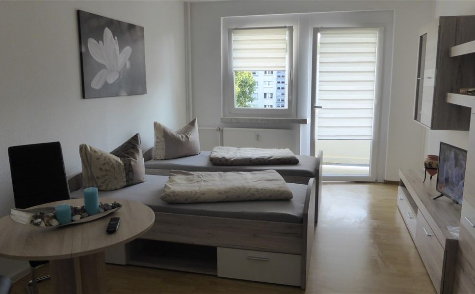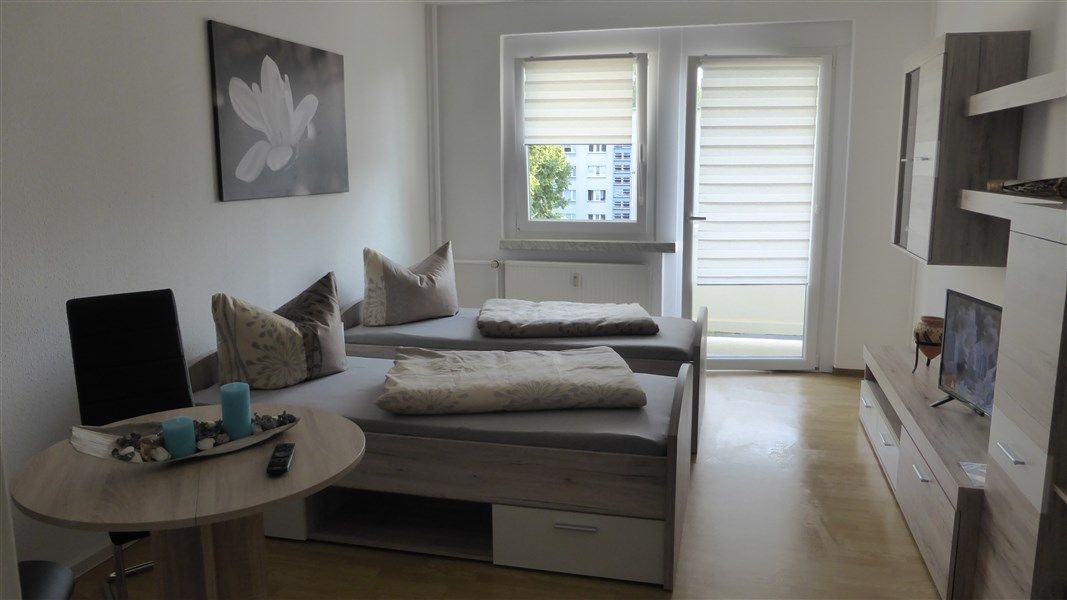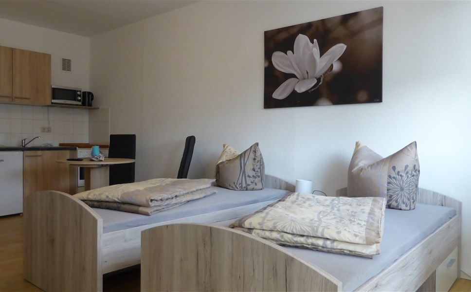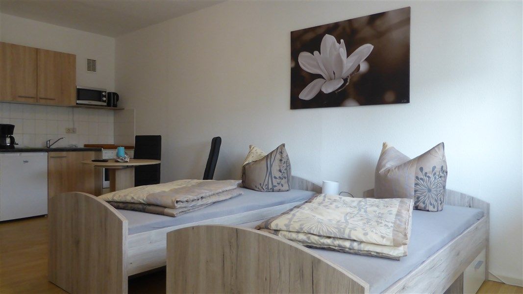 Gemütliche 1-Raum-Gästewohnung für 2 Personen, komplett möbliert, mit Küchenzeile (Kühlschrank, Herd, Microwelle, Kaffeemaschine, Toaster, Wasserkocher, ...), Schlaf- und Wohnbereich (2 Einzelbetten) sowie einem schönen Bad mit Dusche.